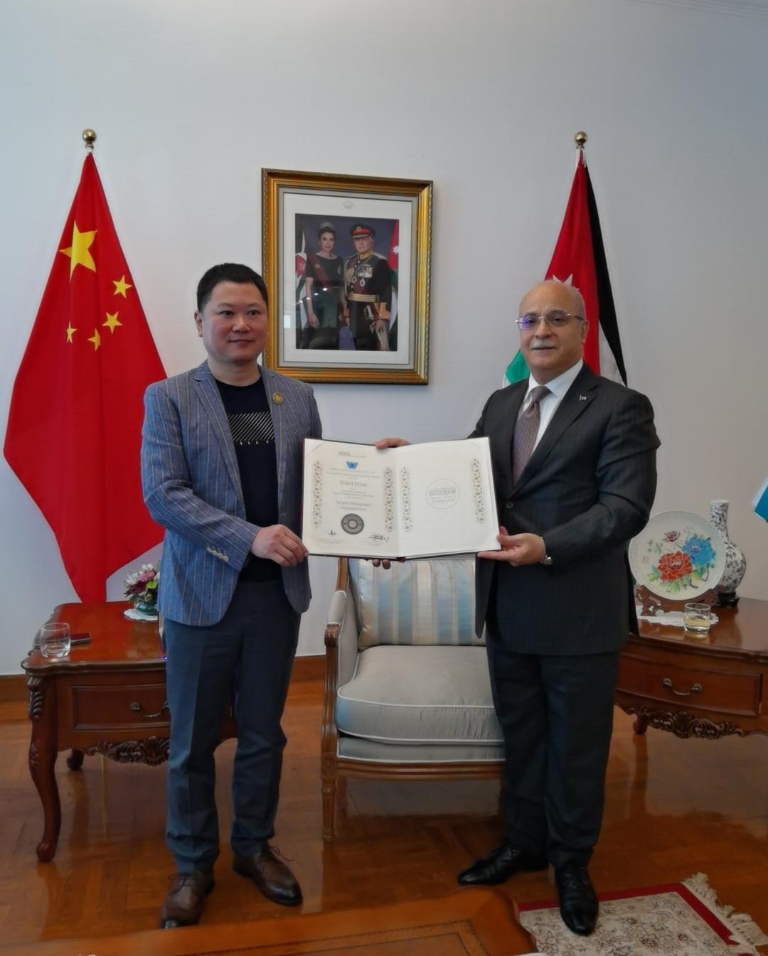 世界洪门组织(WHMO)理事长、洪门金华山山主陈学刚(观澜)5月28日在约旦驻华使馆领取获奖证书时的讲话: